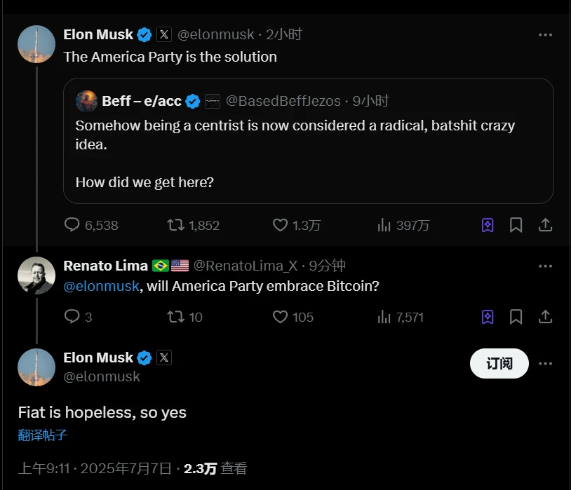7月6日,一名X平台用户就美国政党对比特币态度提问,特斯拉首席执行官埃隆·马斯克回应指出,现行法定货币体系已无出路,并确认”America Party”将接纳比特币。该言论通过社交媒体平台公开传播。