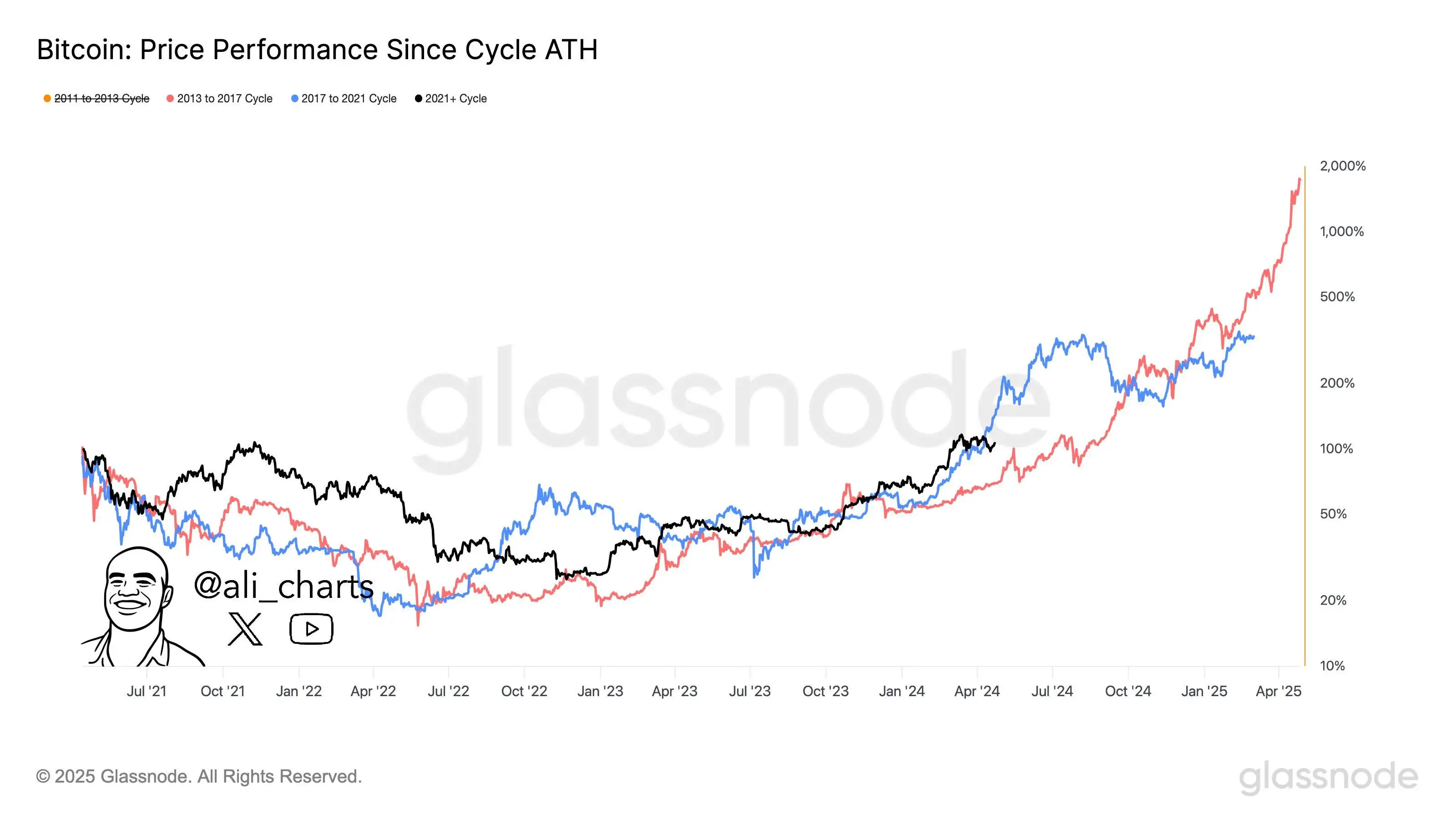 6月9日,链上分析师Ali指出,若本轮牛市周期与此前两轮保持相似轨迹,加密货币市场或于未来6个月后触及下一轮周期峰值。