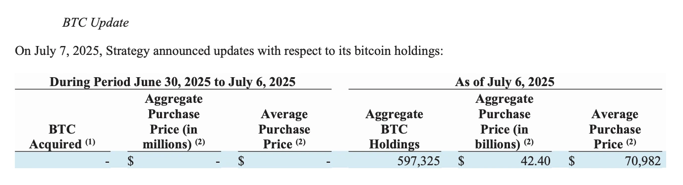 根據官方披露文件顯示,Strategy 在 6 月 30 日至 7 月 6 日期間未進行比特幣採購操作。