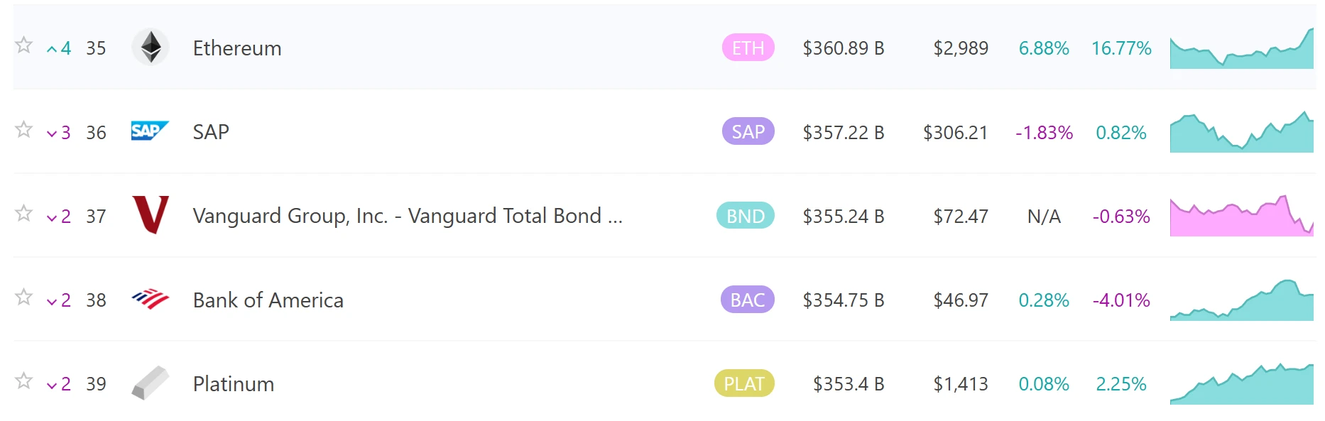 以太坊市值达3616.8亿美元,位列全球资产第35位