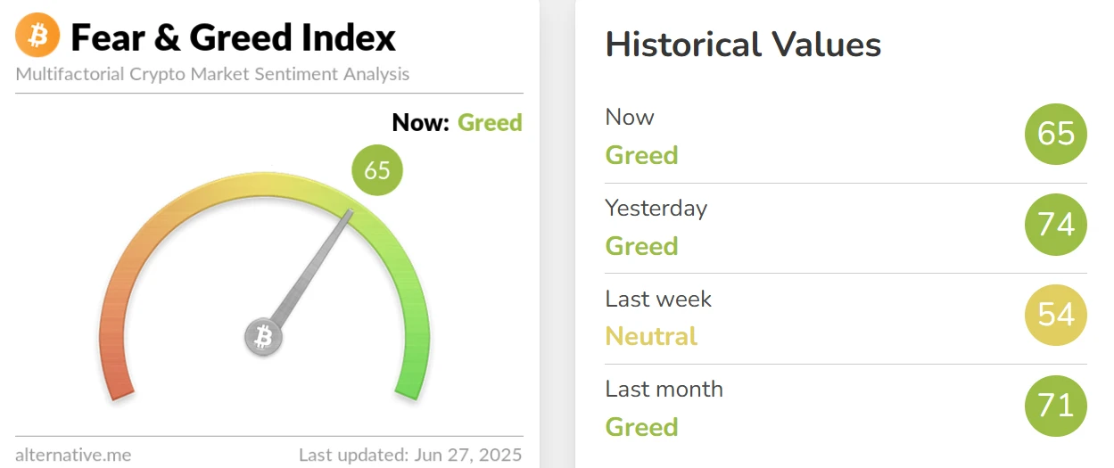 6月27日,Alternative.me数据显示,加密货币恐慌与贪婪指数由前一日的74下降至65,市场情绪维持”贪婪”等级。