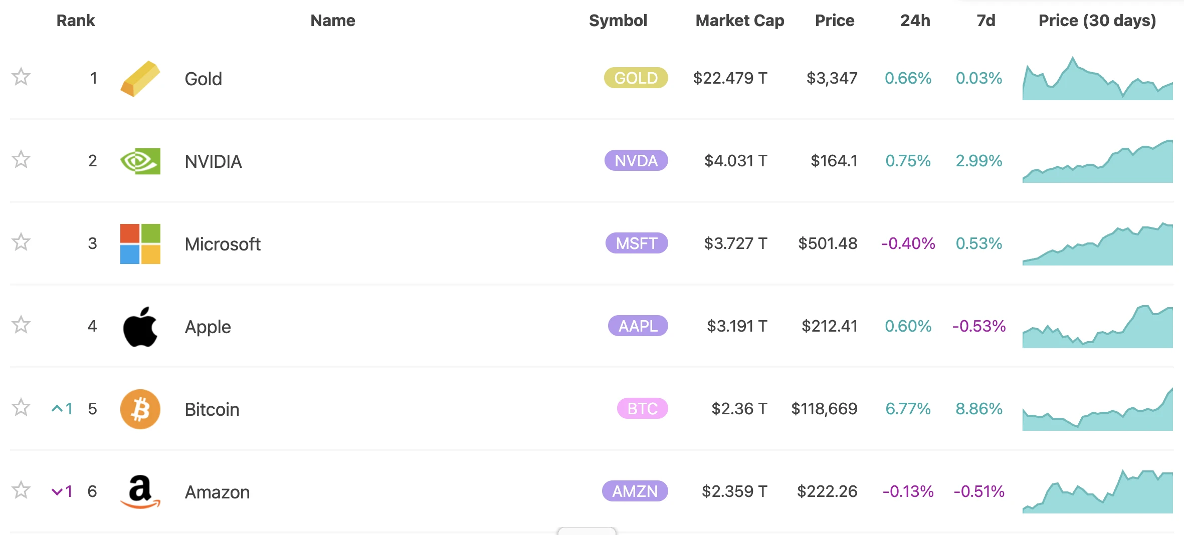 7月11日,据8market数据显示,比特币市值达2.36万亿美元,在全球资产市值排名中位列第五。