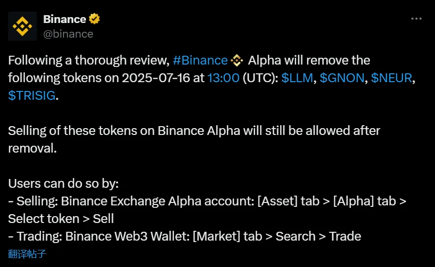 2025年7月16日,币安Alpha官方公告显示,经全面审查后,平台计划于UTC时间2025年7月16日13:00下架LLM、GNON、NEUR、TRISIG代币。代币下架后,用户仍可在该平台进行交易。