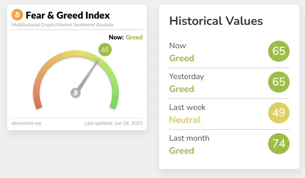 6月28日加密货币恐慌与贪婪指数维持65,市场处于贪婪状态