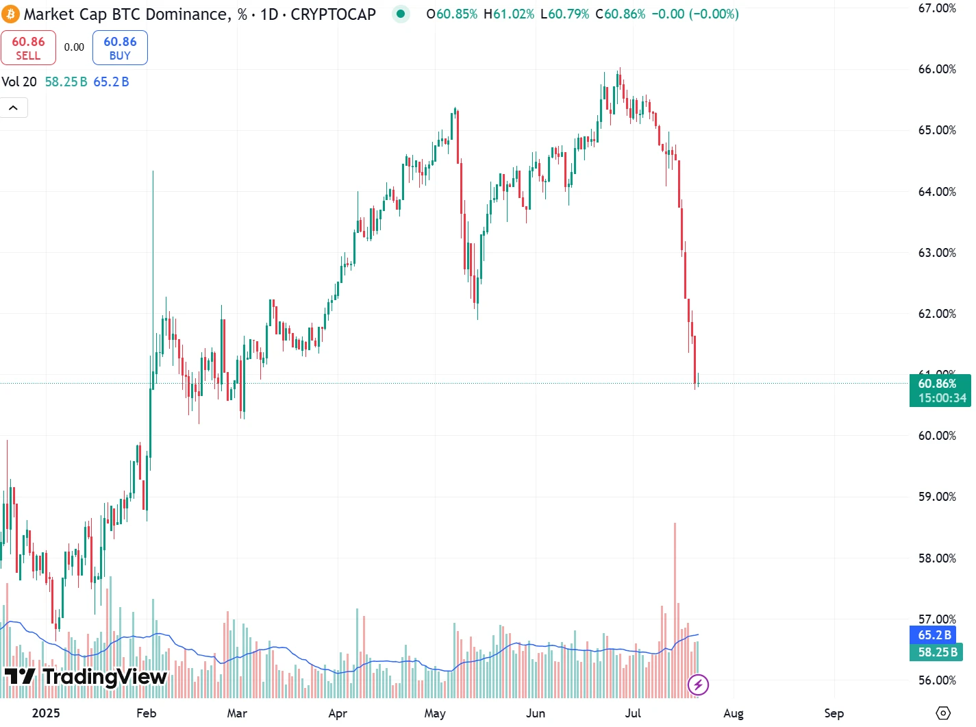 比特币市占比跌破61%创四个月新低 山寨币季节指数单周激增78%