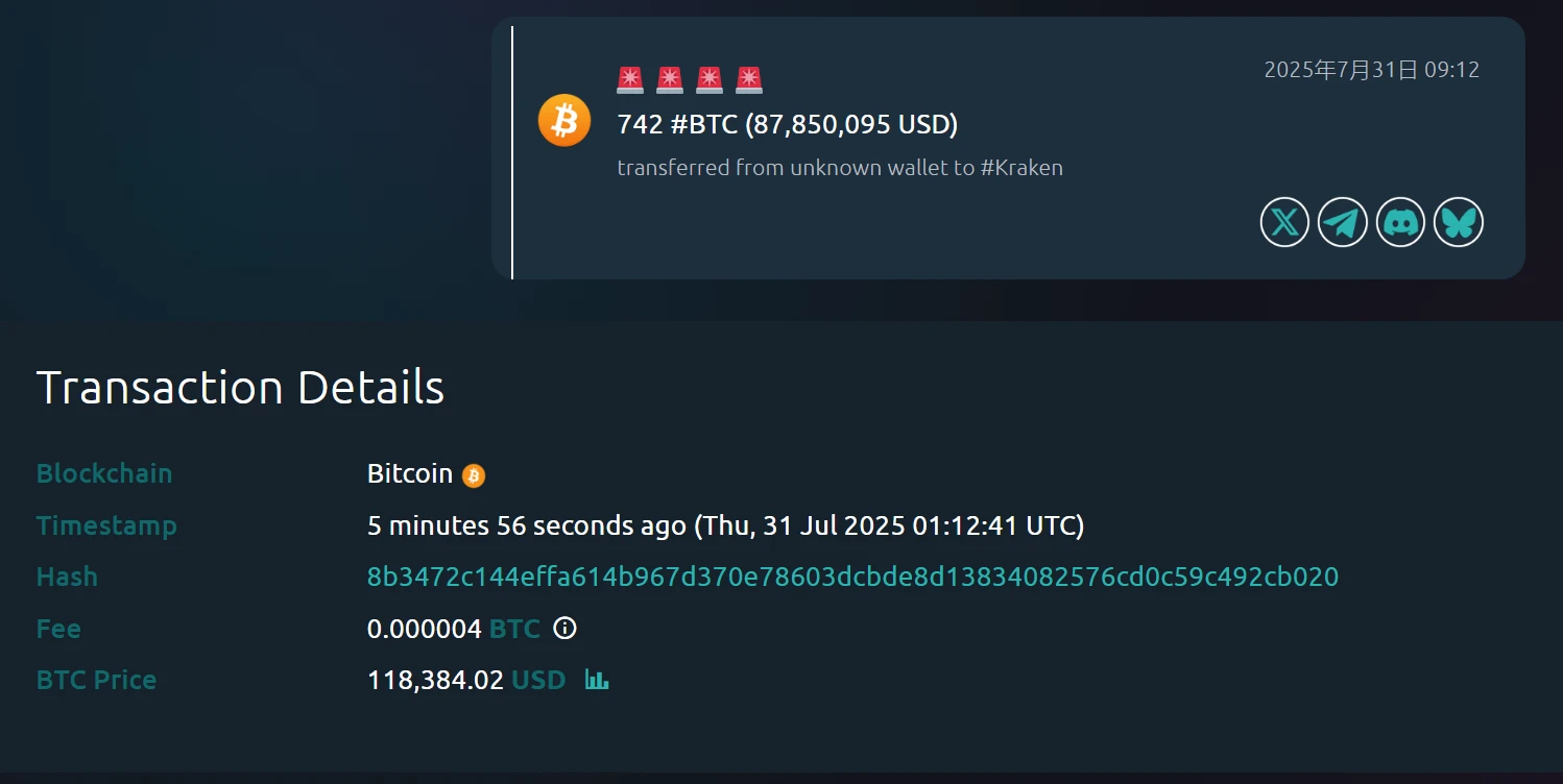 未知钱包向Kraken交易所转入742枚比特币,价值8,785万美元