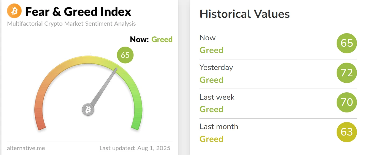 加密货币恐慌与贪婪指数下降至65 市场持续贪婪状态