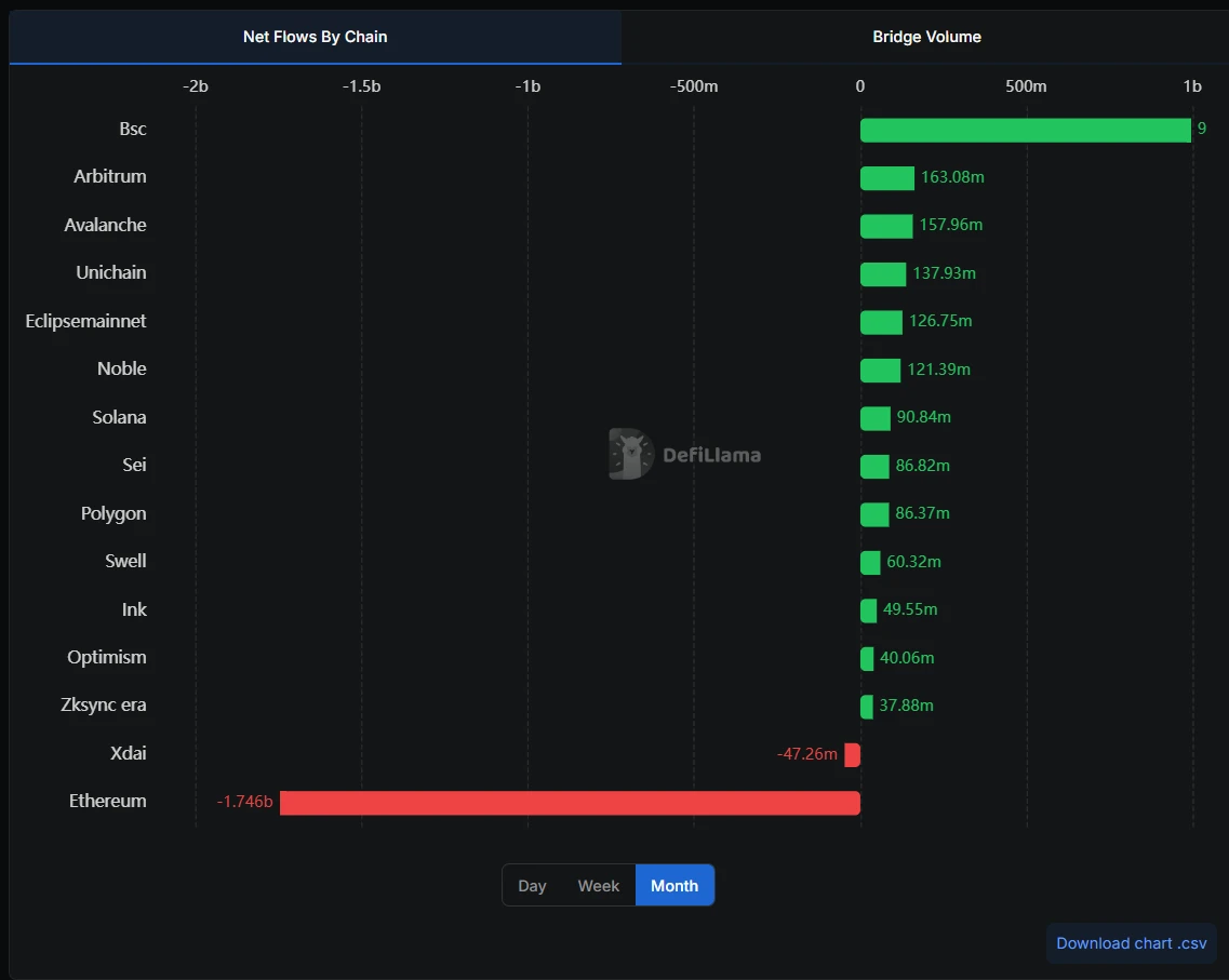BNB Chain跨链桥7日净流入10.08亿美元,以太坊流出9.86亿美元