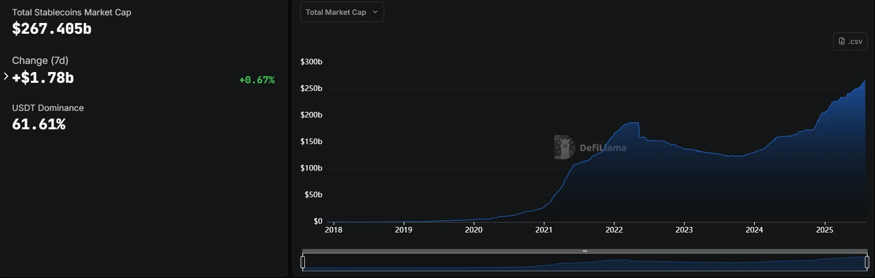 加密市场稳定币市值突破2656亿美元 USDT占比达61.91%