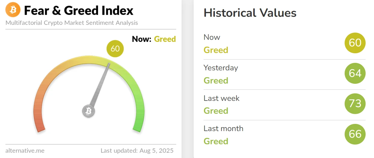 8月18日加密货币恐慌与贪婪指数降至60,市场仍处贪婪状态