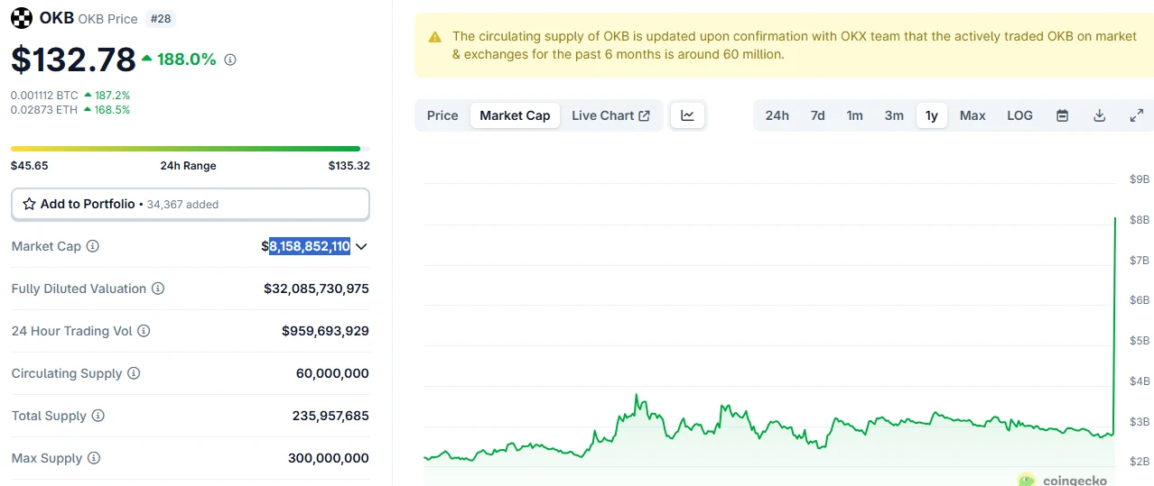 OKB市值跃升至81.58亿美元,跻身加密货币前30名