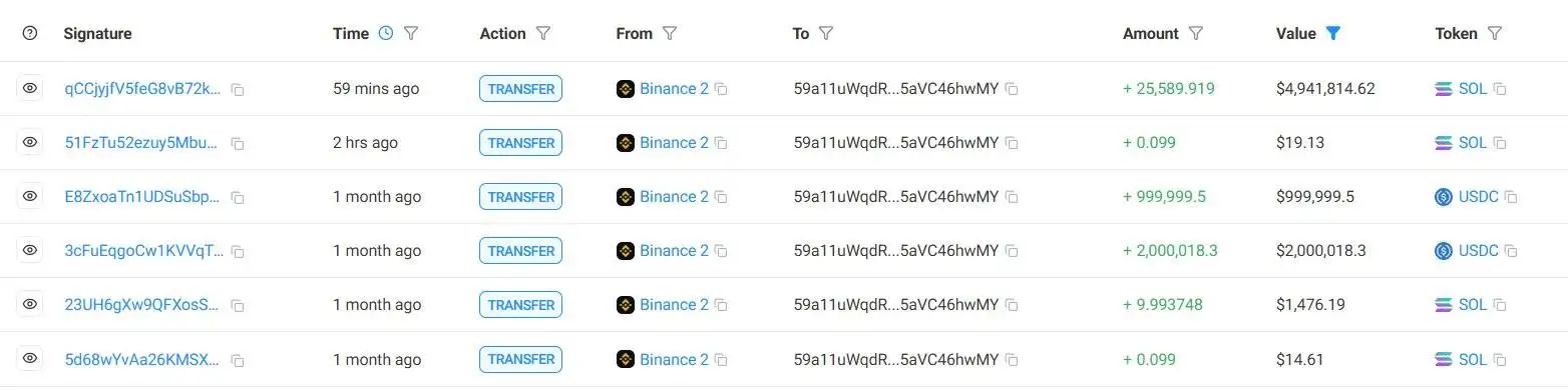 某鲸鱼地址从币安提取25,600枚SOL,价值约494万美元