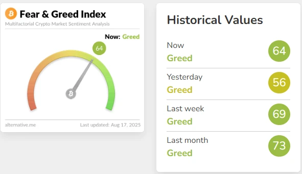 加密货币恐慌与贪婪指数升至64,市场持续贪婪状态