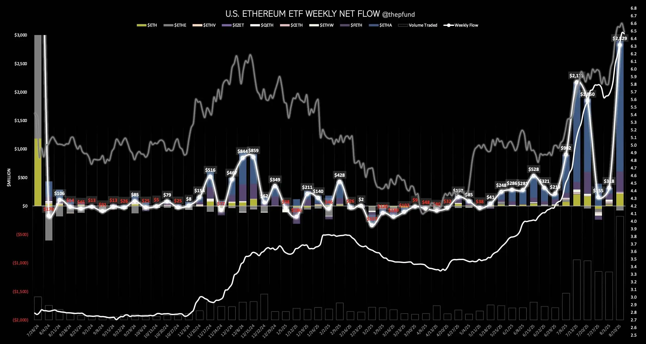 美国以太坊现货ETF8月净流入38.7亿美元创新高 比特币ETF同期净流出7.51亿