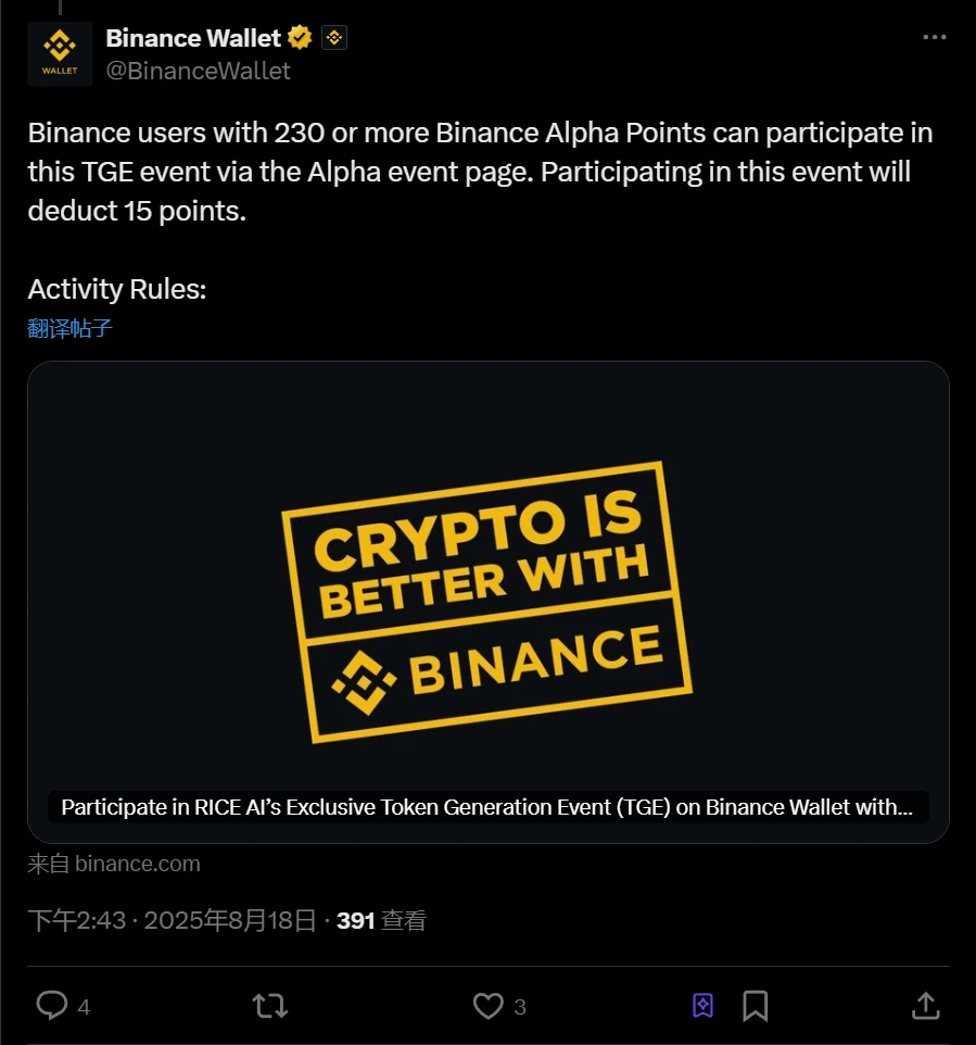 币安用户参与RiceAI(RICE)TGE活动需持有230点Alpha积分