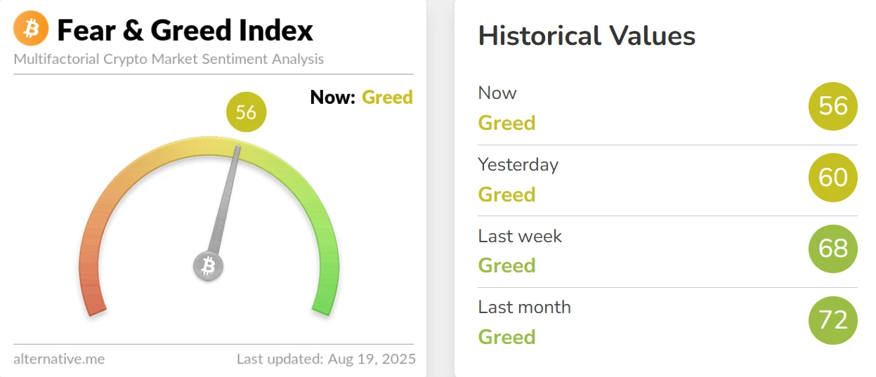 加密货币恐慌与贪婪指数8月19日报56 维持贪婪区间