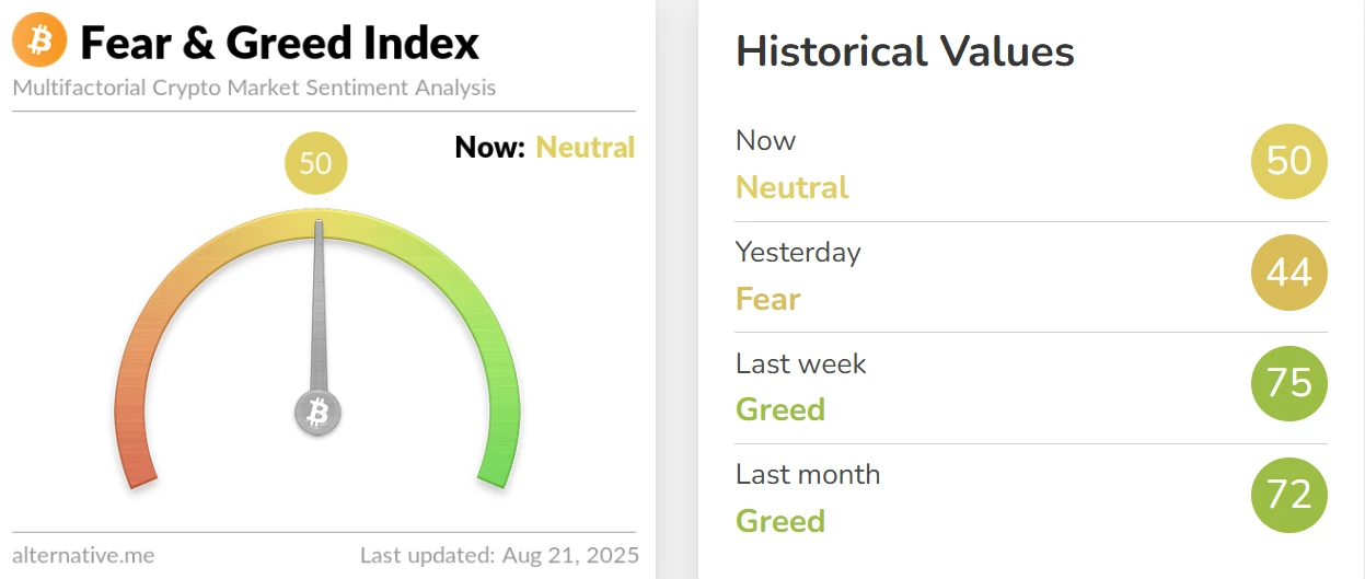 加密货币恐慌与贪婪指数升至50,市场情绪转为中性