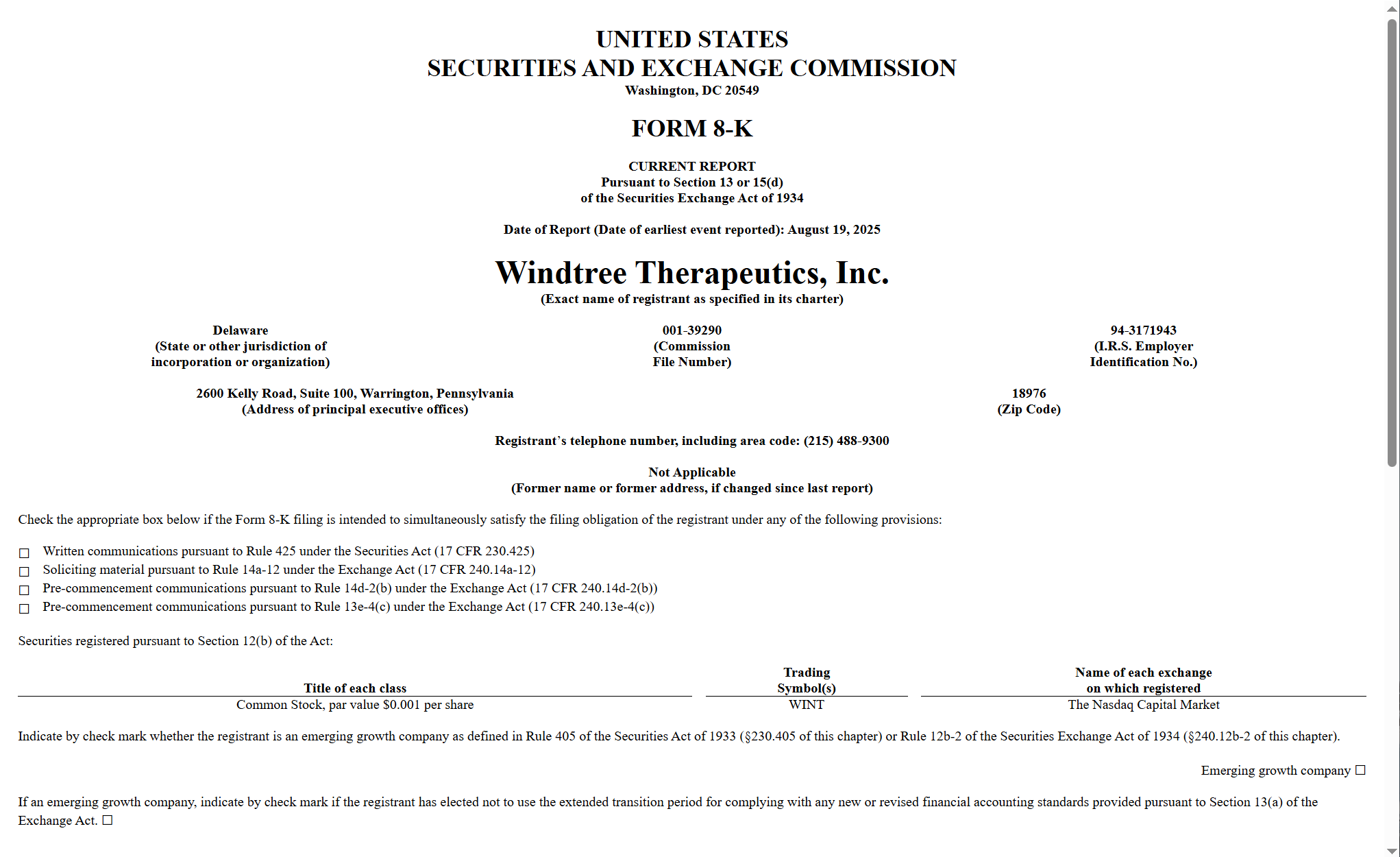 Windtree Therapeutics因未达标纳斯达克退市 将转场外交易市场