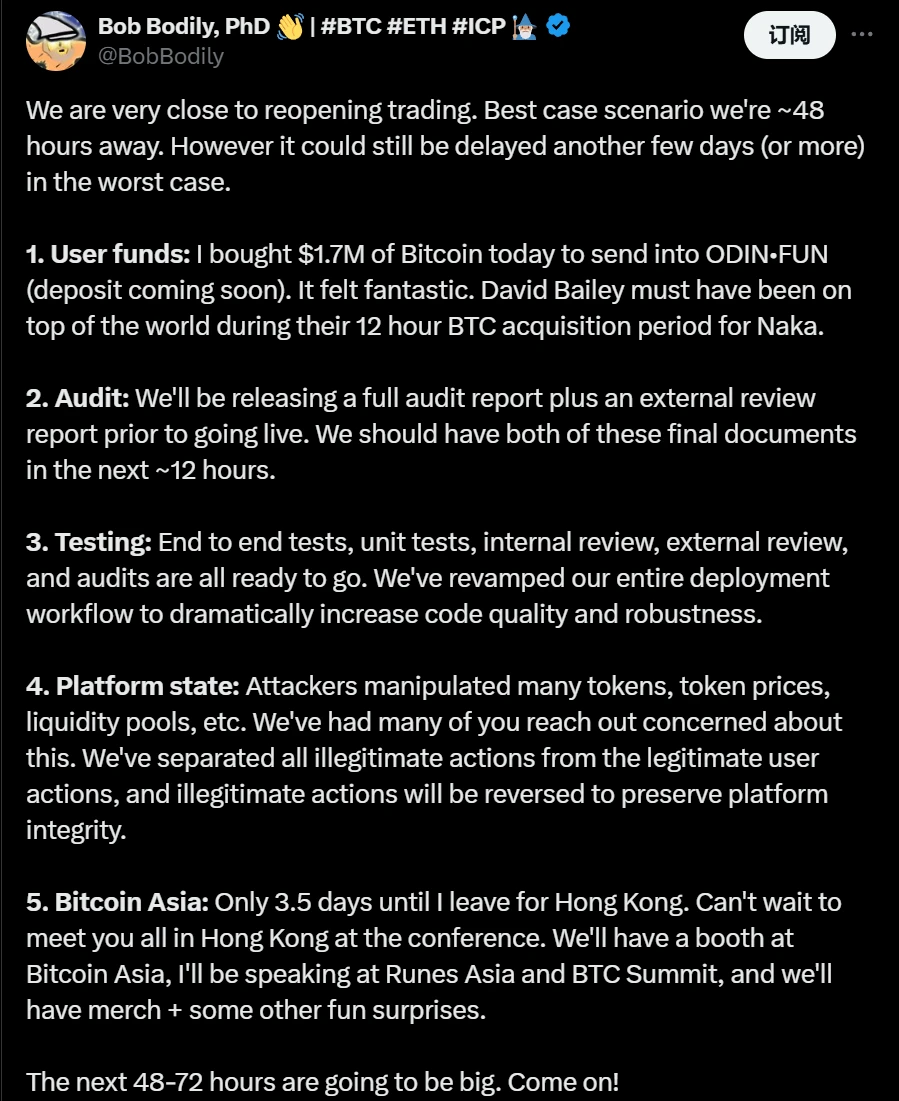 Odin.fun平台交易功能即将重启 流动性补充及审计进展披露