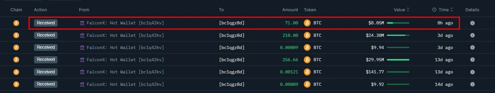 巨鲸地址单日接收71枚比特币 两周累计增持超500枚