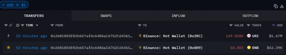 某新建钱包向币安热钱包转入149,028枚UNI代币,价值167万美元