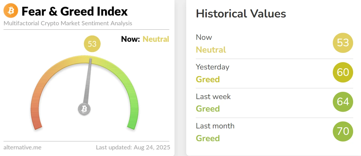 加密货币恐慌与贪婪指数降至53,市场情绪转为中性