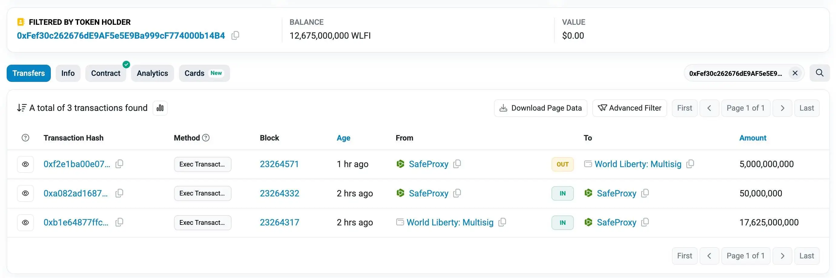 WLFI多签地址转移2亿代币至新地址,历史小额转账记录曝光