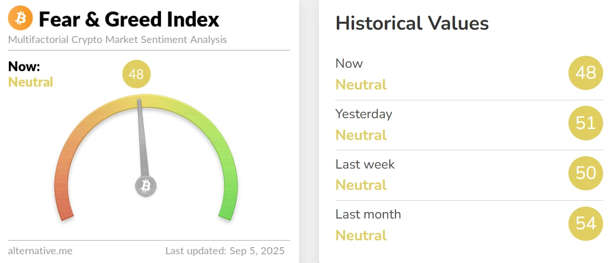 9月6日加密货币恐慌与贪婪指数维持48 市场处于中性状态
