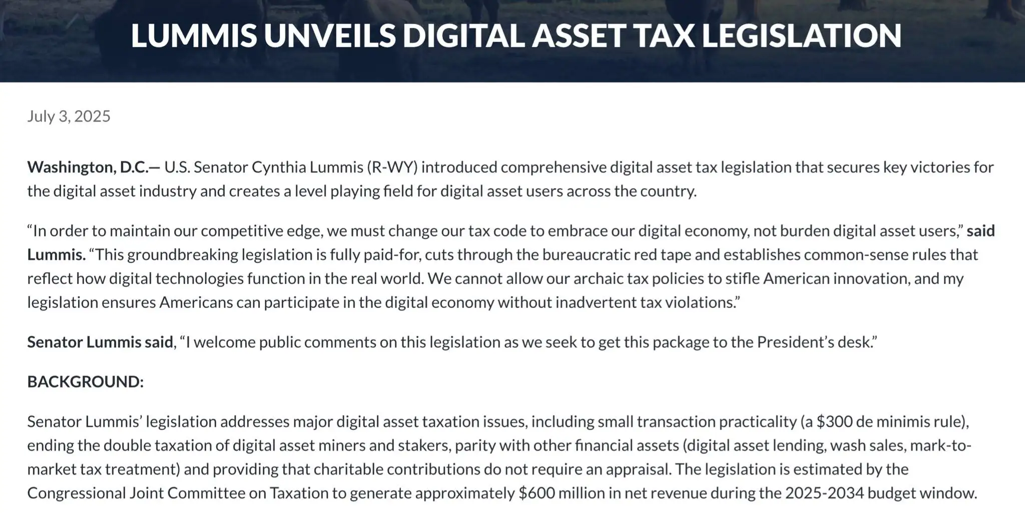 7月3日,美国参议员 Cynthia Lummis 通过其官方渠道披露新法案内容,该立法提案聚焦数字资产行业税收制度优化,涵盖多项核心改革措施。法案规定单笔交易价值不超过300美元的数字资产交易可享受免税政策,同时取消针对数字资产挖矿及质押活动的双重征税机制,并确立数字资产在借贷、销售、市值计税等方面与传统金融资产的等效税务处理原则。针对慈善捐赠场景,法案明确免除相关资产评估程序。