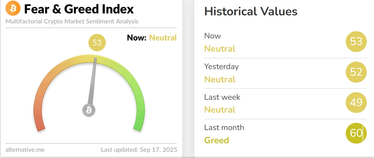加密货币恐慌与贪婪指数降至53,市场情绪转为中性