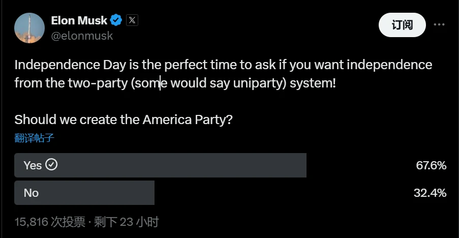 6月9日,埃隆·马斯克在社交媒体发起关于组建”美国党”的民意调查。数据显示,累计15,816名用户参与投票,其中67.6%投票者选择支持选项,反对者占比32.4%。该投票窗口剩余23小时结束。