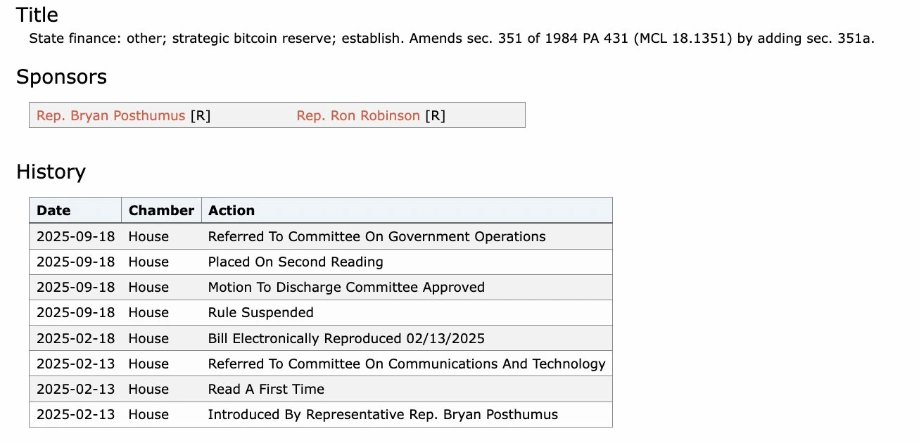 密歇根州比特币储备法案HB 4087进入众议院二读阶段 最高允许10%州财政资金投资加密货币