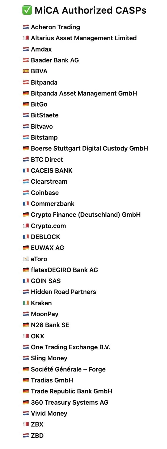 获MiCA许可的39家CASP机构分布在9个欧盟/欧洲经济区国家,许可名单涵盖传统金融机构(如BBVA、Clearstream、CACEIS)、金融科技平台(如N26、Trade Republic、eToro、Robinhood)以及原生加密企业(如Coinbase、Kraken、Bitpanda、OKX、Bitstamp)。
