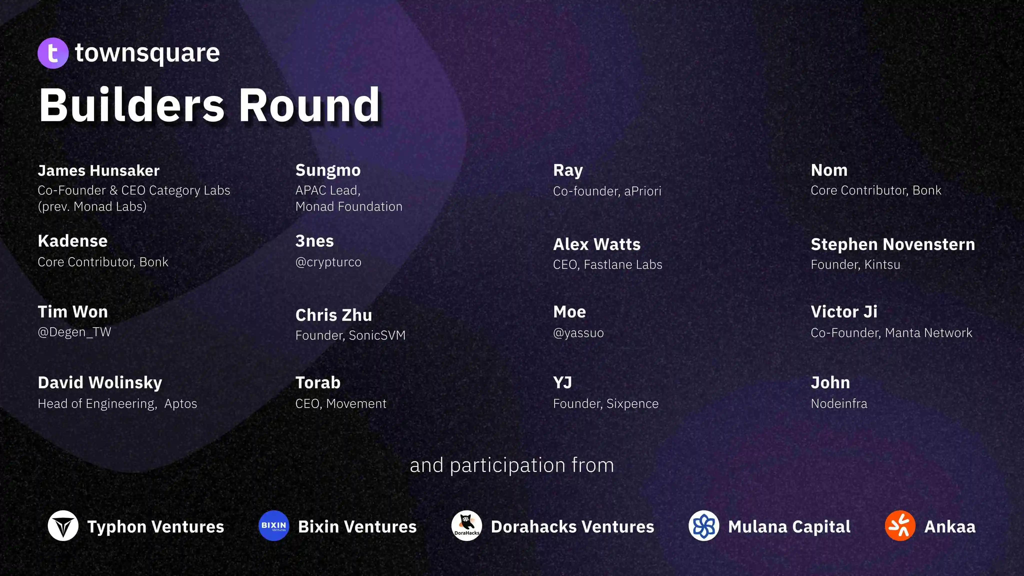 模块化货币市场协议 TownSquare 于 6 月 27 日宣布完成建设者轮融资,投资方包含 Typhon Ventures、Bixin Ventures、Dorahacks Ventures、Mulana Capital 及 Ankaa 等机构。