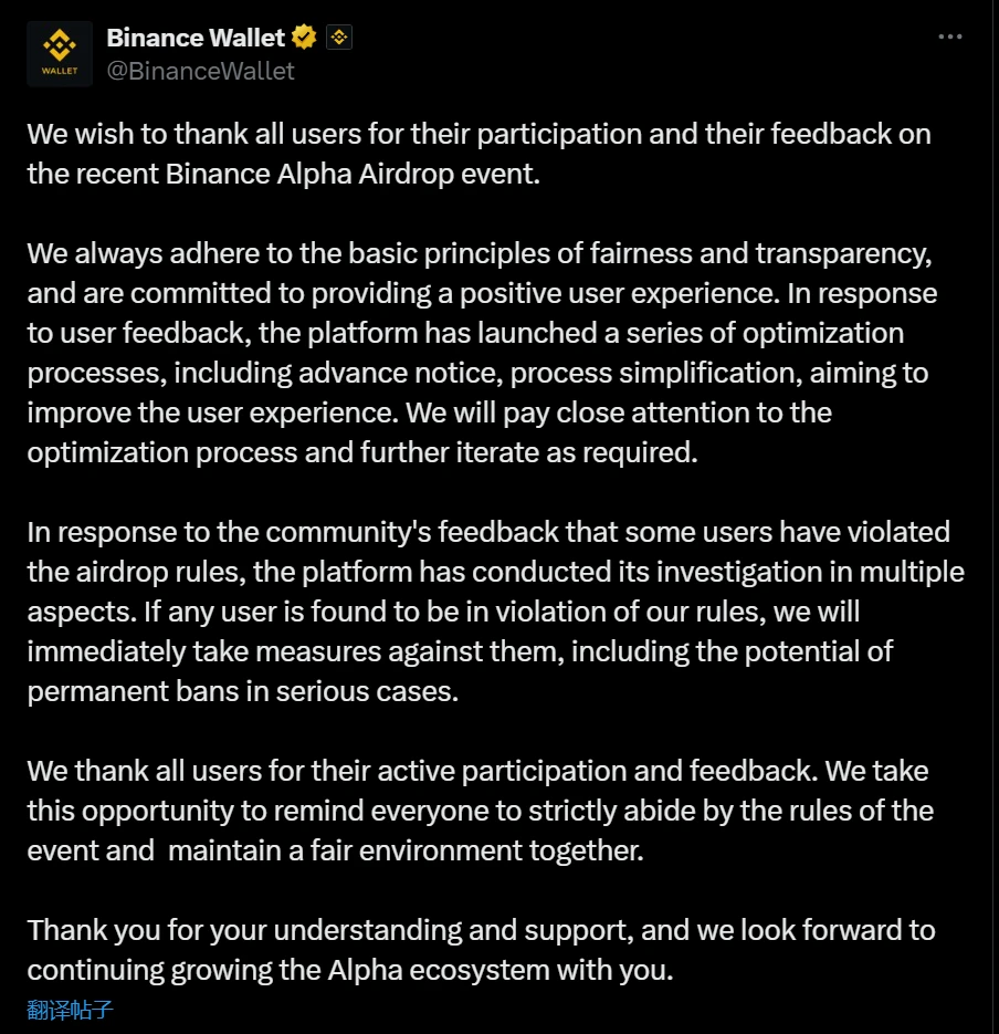 币安 Alpha 推出优化措施提升空投参与,将调查违规行为并可能封禁账户