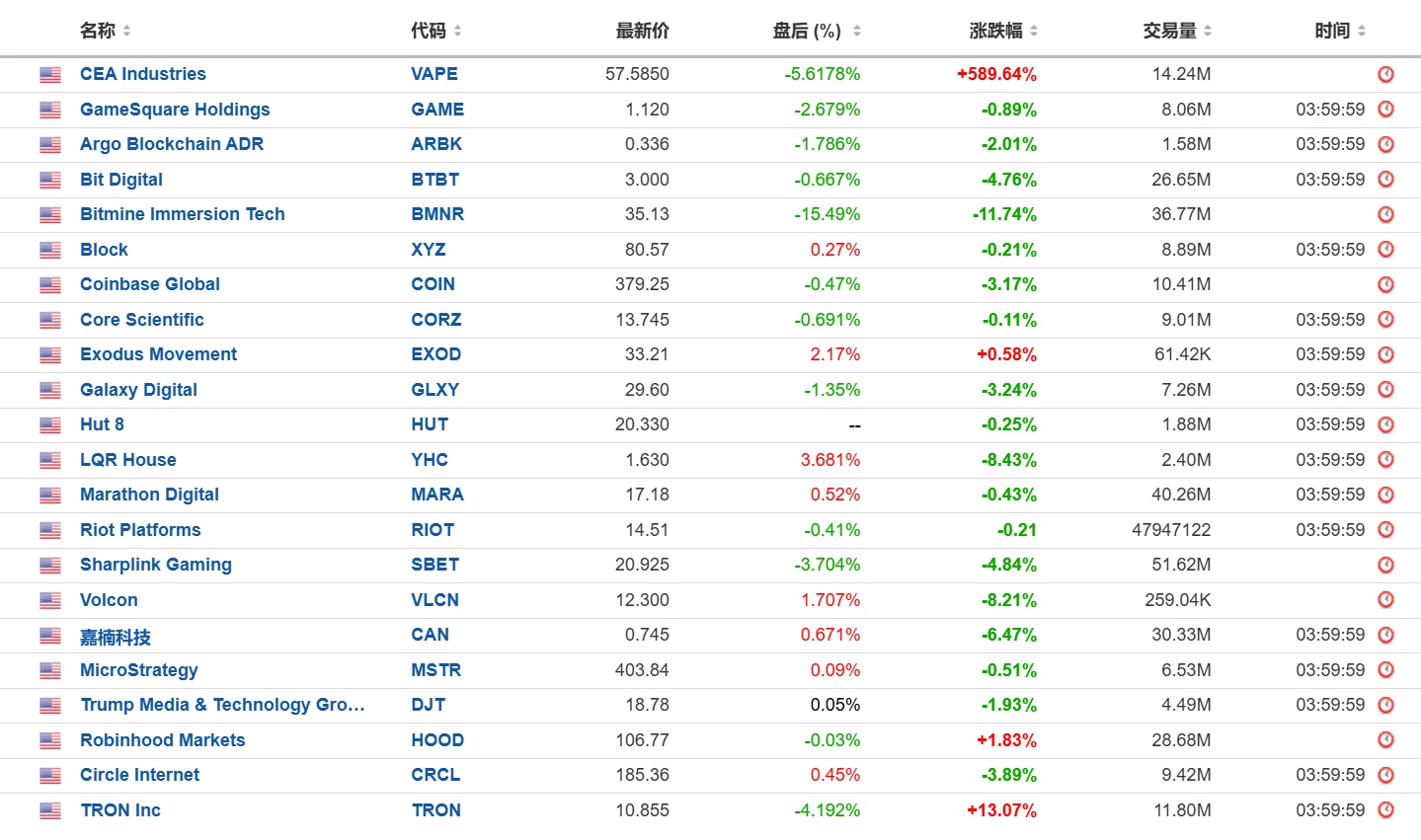 美股加密概念股7月29日收盘多数下跌,TRON与CEA Industries逆势飙升