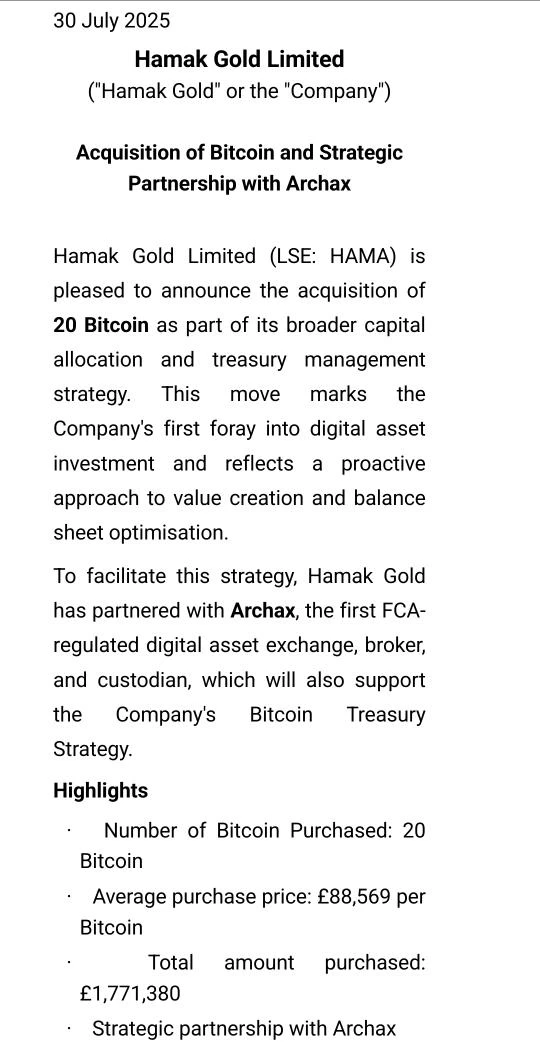 英国上市公司Hamak Gold Limited购入首批20枚BTC