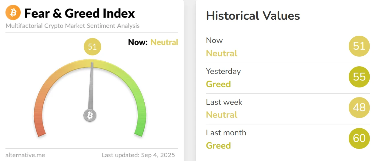 加密货币恐慌与贪婪指数回落至51,市场情绪转为中性