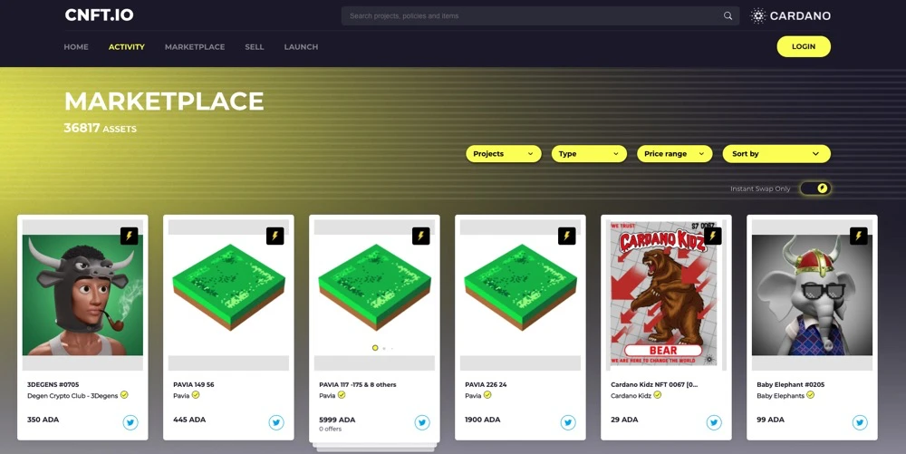 CNFT.IO是Cardano链上较早推出的NFT市场,由全球化团队于2021年7月开发。平台提供NFT交易量排名、24小时及7天交易数据统计,支持通过邮箱登录和Cardano钱包连接。其市场费用和版税均为2.5%(最低1 ADA)。