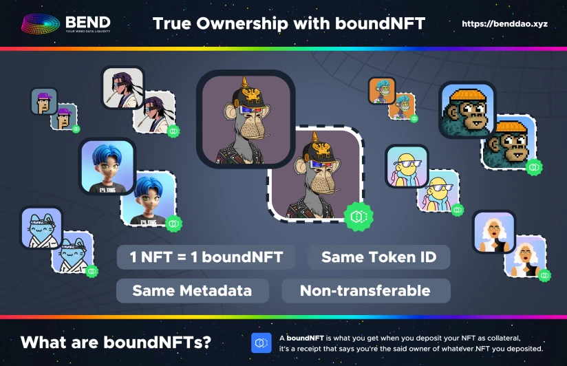 BendDAO创新性地采用了点对池的NFT抵押借贷模式。在该模式下,借款人可以将符合条件的蓝筹NFT作为抵押品,通过协议借入ETH。协议通过将NFT资产转换为ERC721标准的boundNFT来实现这一过程。boundNFT是与原始NFT1:1锚定的镜像代币,在借款和偿还时进行铸造和销毁,其持有者可以用作抵押品的同时,仍能保留NFT的元数据和代币ID,便于在社交媒体上展示。